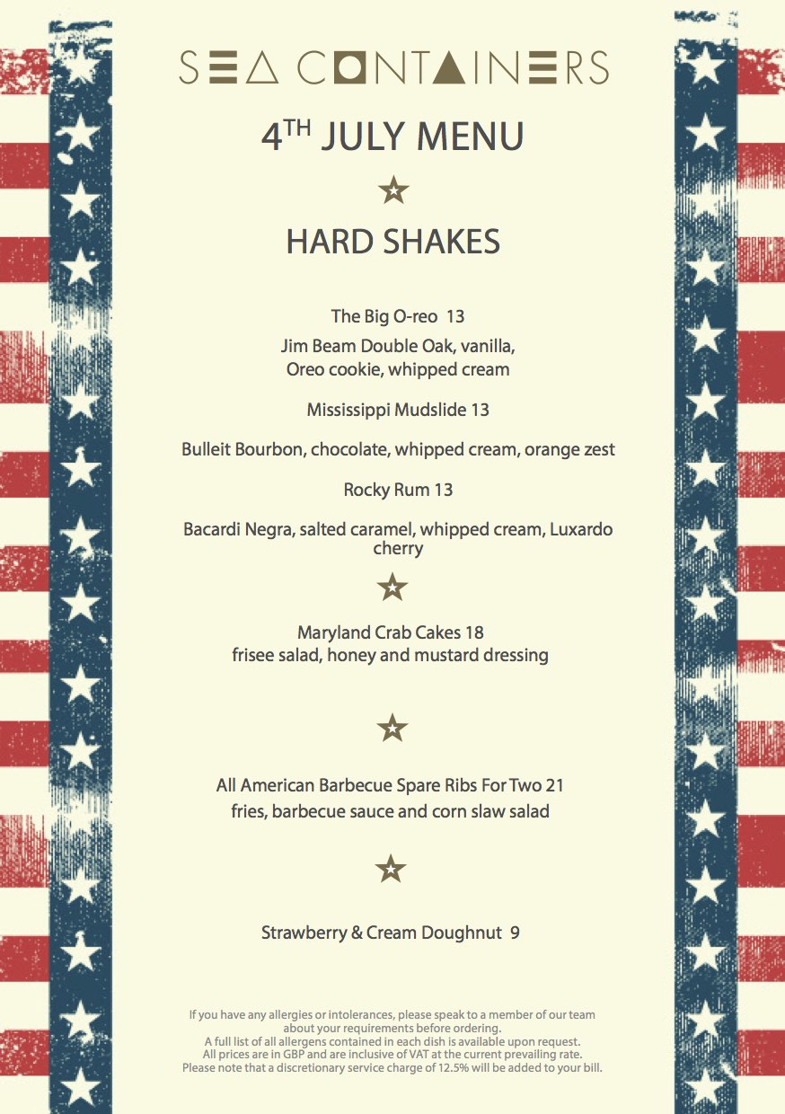 The hotel’s restaurant Sea Containers, will draw on its American legacy to create a special 4th July menu, comprising classic American dishes including, ‘Maryland Crab Cakes’, ‘All American Barbecue Ribs’ and for dessert, ‘Strawberries and Cream Donut’. Sitting alongside the menu will be a special Woodford Reserve cocktail and boozy hard shake. The menu will be available to enjoy from 4th – 8th July, alongside the restaurants a la carte menu. Should London be graced with sunshine, guests will also be able to enjoy the American menu on the recently opened Midsummer Terrace, which is located directly on the Thames River path.